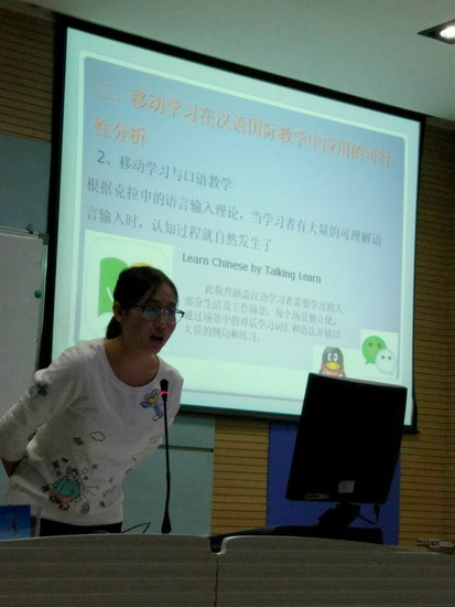 报告会上,2015级硕士生赵孟超同学以自己访学的学校为例,从台湾的气候、地理环境、人文因素、文化教学等几个方面入手,对台湾华语教学特点进行了详实的解读。李霁珊同学从移动学习的定义及特点、汉语国际教学特点分析、移动学习在汉语国际教学中应用的可行性分析等几个方面对移动学习在汉语国际教学中的可行性进行了详实的分析讲解。