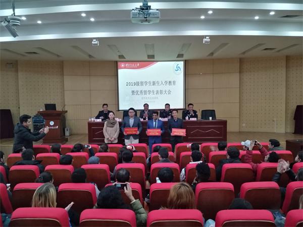 10月31日下午,2019级职工新生入学教育暨优秀职工表彰大会于逸夫图书馆逸夫报告厅举行。兰州市公安局出入境管理处蔡利成科长、兰州市公安局入境管理处警官张炜,甘肃省国际文化交流协会副秘书长魏明旺、对外交流部部长彭颖,w88win优德副经理田河、w88优德官网职工管理干部及w88优德官网2019级职工100余人参与此次会议。田河主持会议。