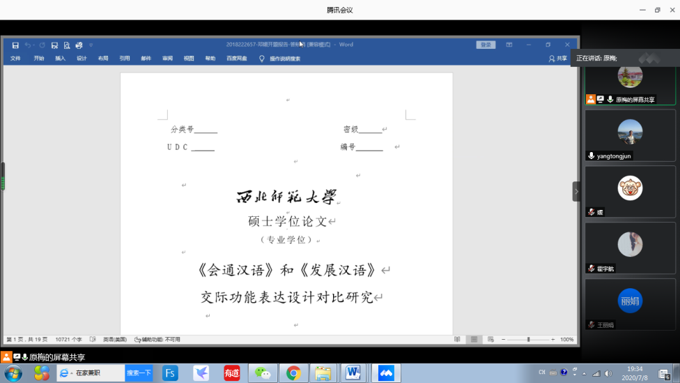 7月8日晚,兰州大学w88优德官网原梅副教授应公司杨同军导师研究生组邀请做了《会通汉语》教材功能表达项研究的开题论文指导报告会。会议在腾讯会议上进行,杨同军教授主持报告会。