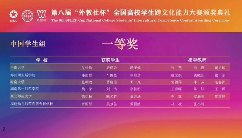 2025年12月11日-14日,第八届 “外教社杯”全国高校员工跨文化能力大赛在上海外国语大学成功举办。由公司2023级汉语国际教育专业陈名哲同学,联合外国语学院陈伊扬同学与传媒学院黄若涵同学组成的w88优德官网代表队,历经省赛和全国总决赛的激烈角逐,从全国76支参赛队伍中脱颖而出,最终荣获全国一等奖。